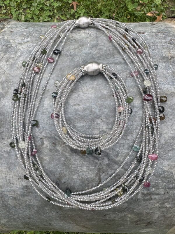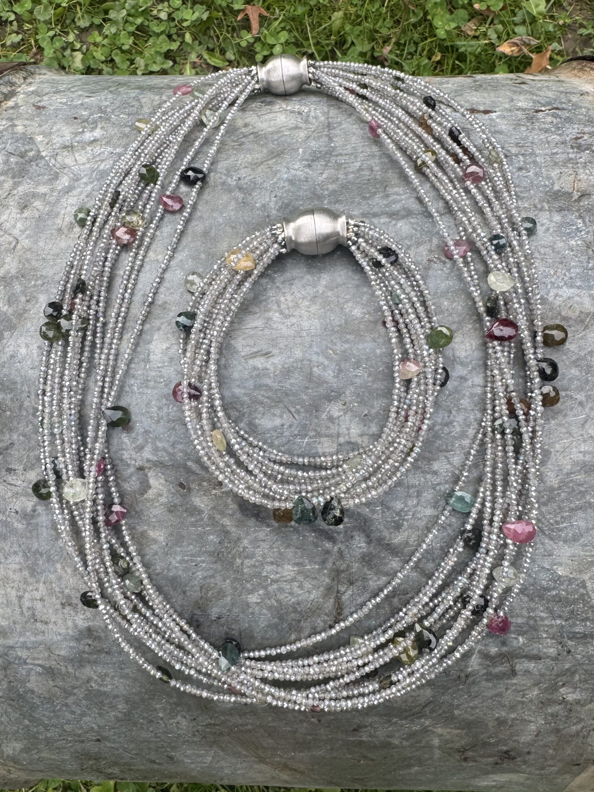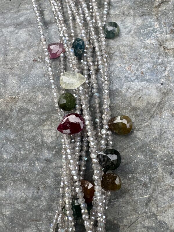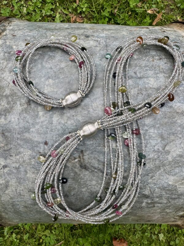 Elegantes Armband aus besonders schönem facettiertem Labradorit (2 mm) und Turmalintropfen (ca 7 x 5 mm). Der hochwertige Magnet besteht aus Silber.