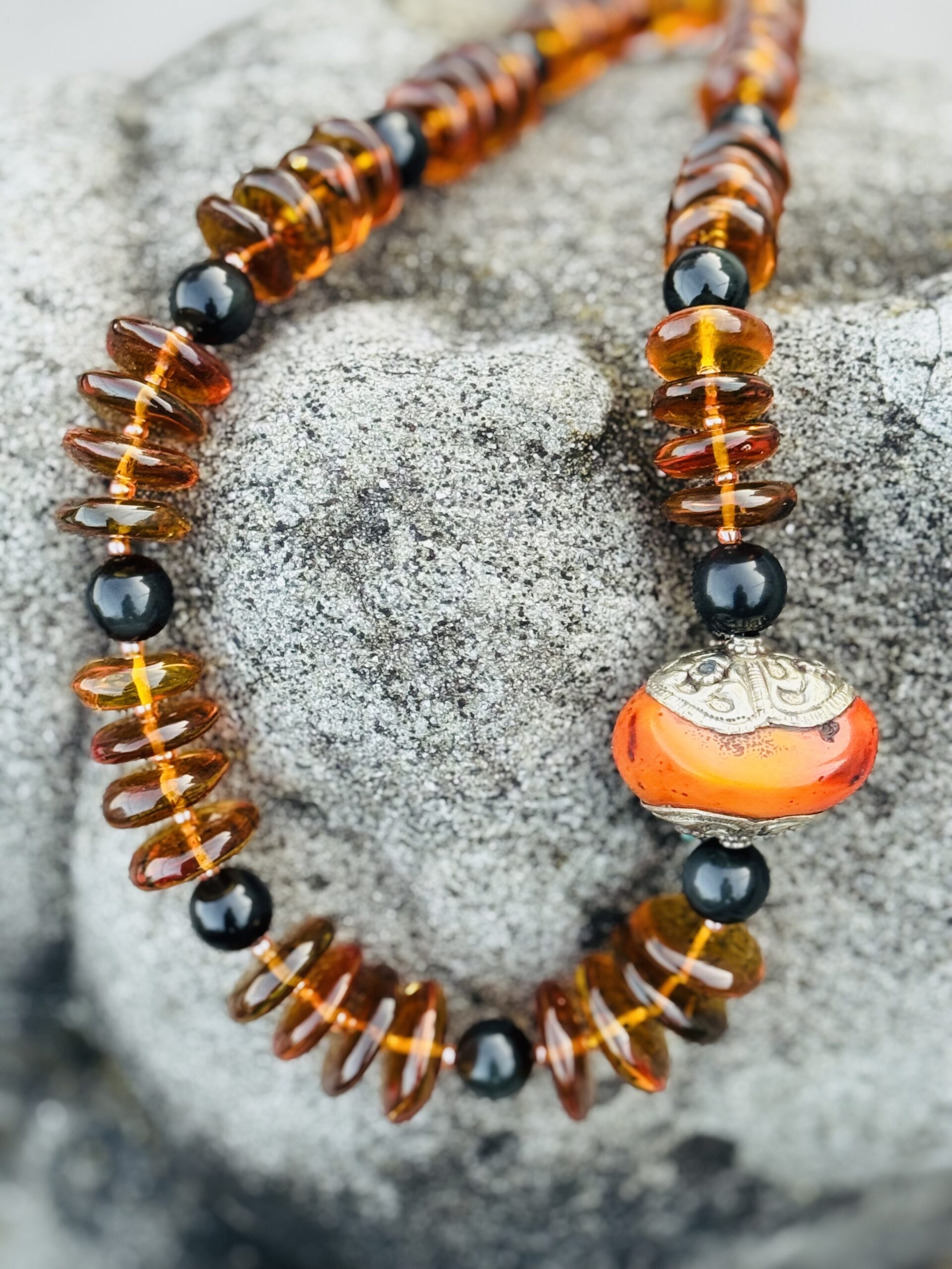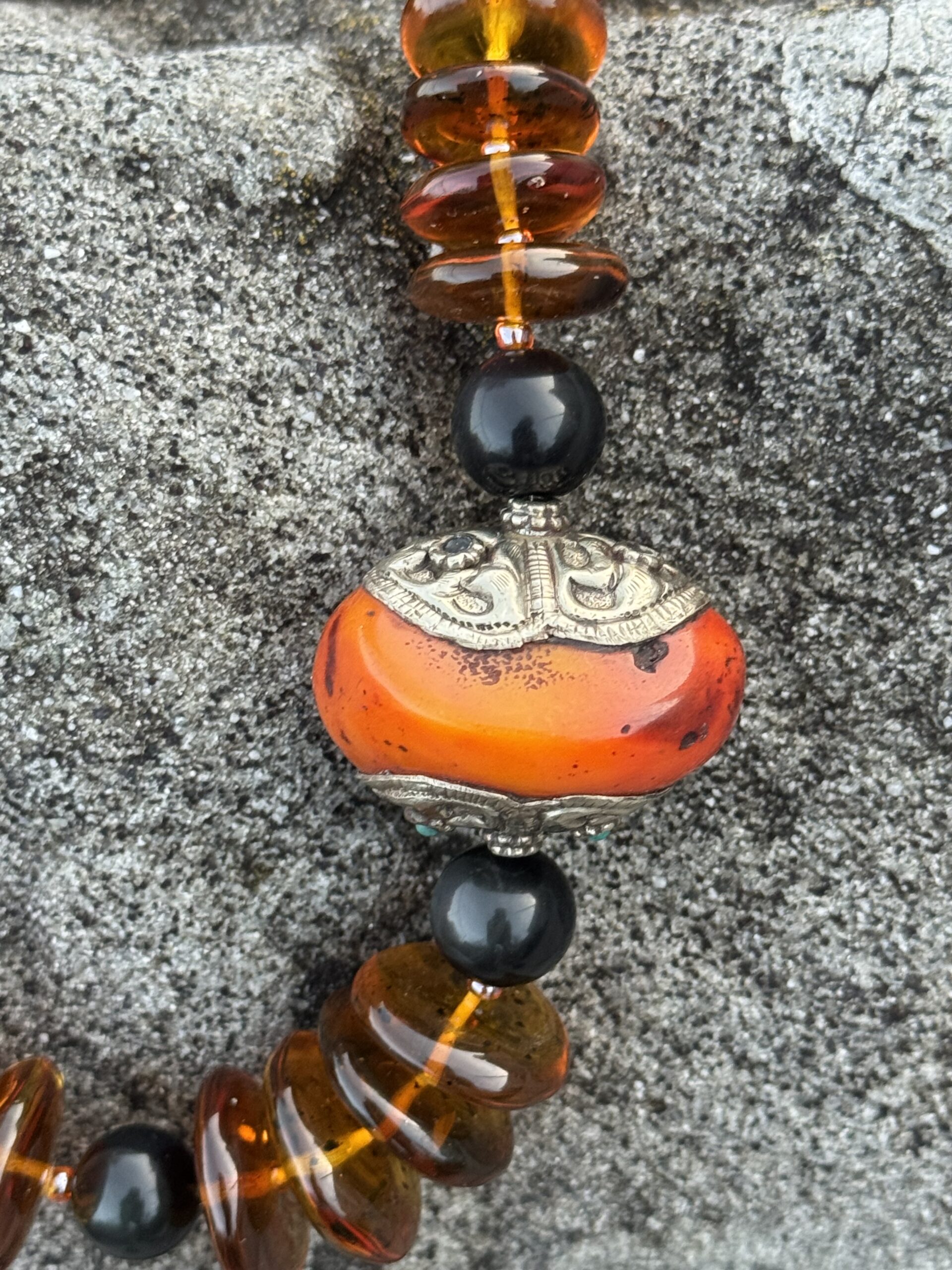 Kette aus Scheiben aus Bernstein (ca. 20 x 7 mm), Kugeln aus Obsidian (10 mm) und einem alten Teil aus Tibet (40 x 30 mm). Der Teil aus Tibet besteht aus Bernstein der in Silber gefasst ist. Als Verschluss wurde ein großer Silberkarabiner eingesetzt.