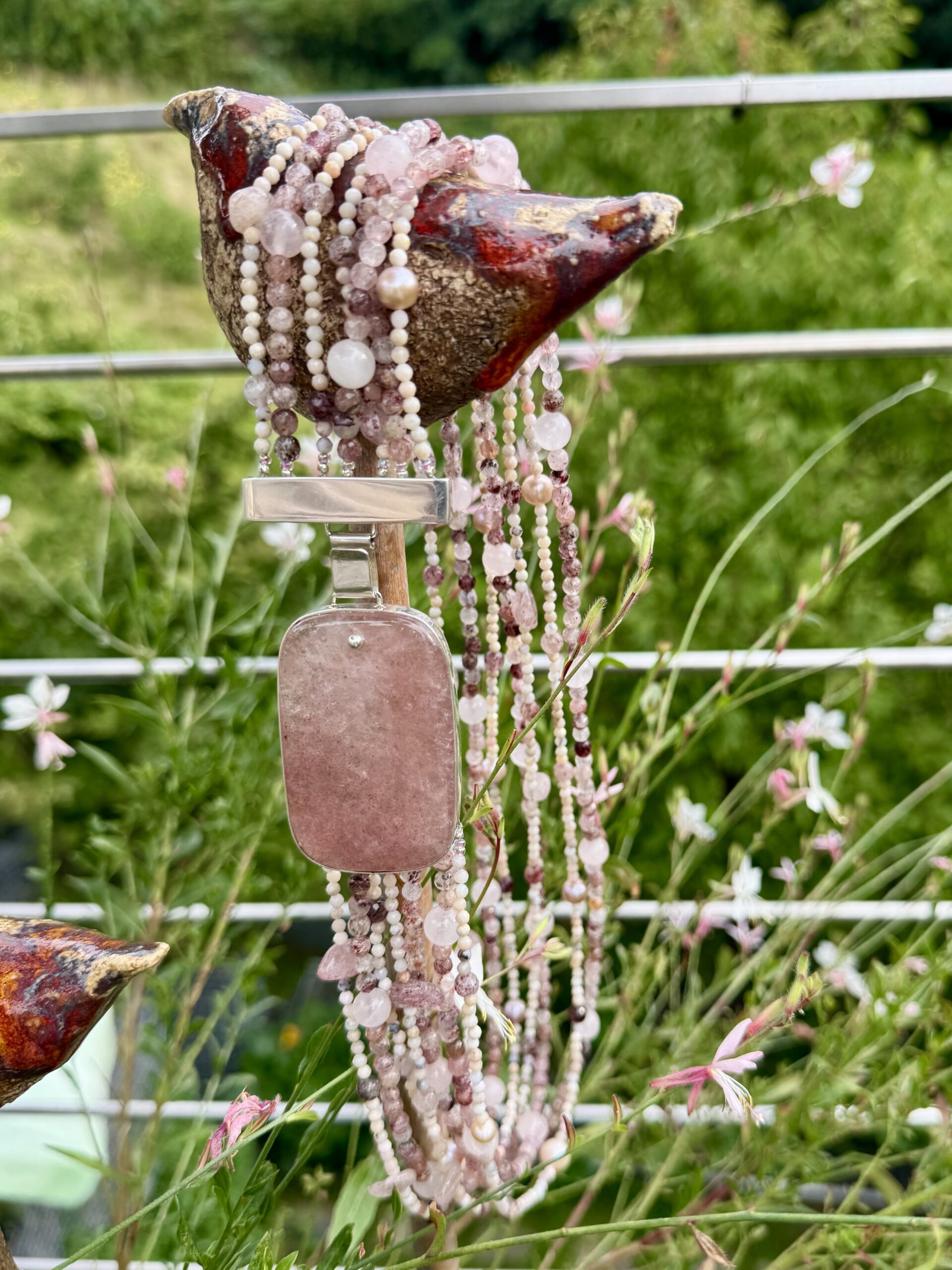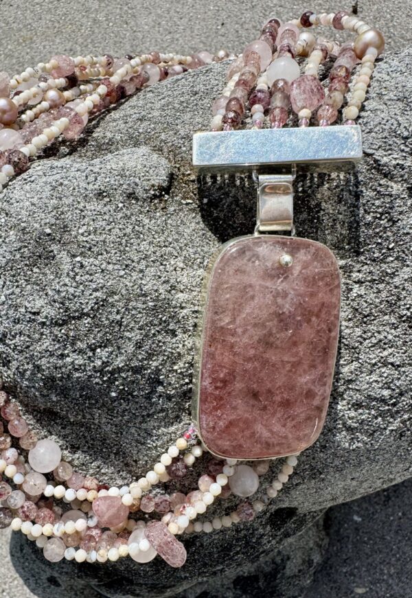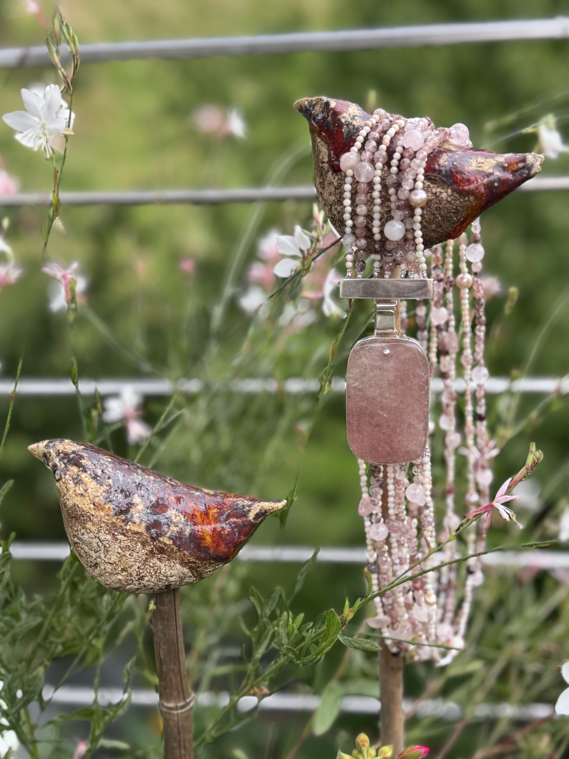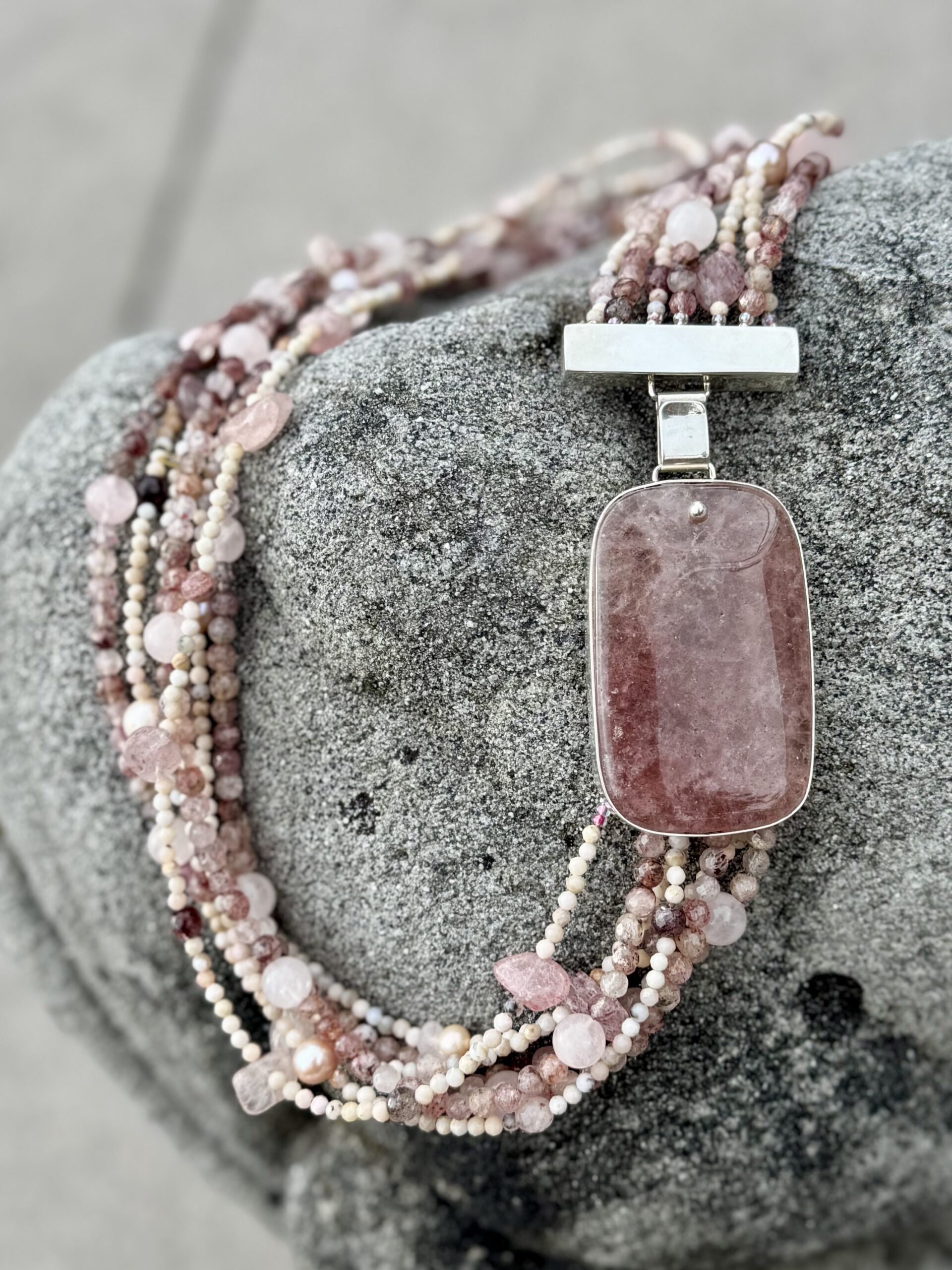 Dieses altrosafarbene Collier besteht aus facettiertem Quarz, Kugeln aus Rosenquarz, unregelmäßigem Quarz mit natürlichen rosa Einschlüssen und facettiertem rosa Opal aus den Anden. Für den Verschluss wurde ein in Silber gefasster ebenfalls naturfarbener rosa Quarz verwendet.